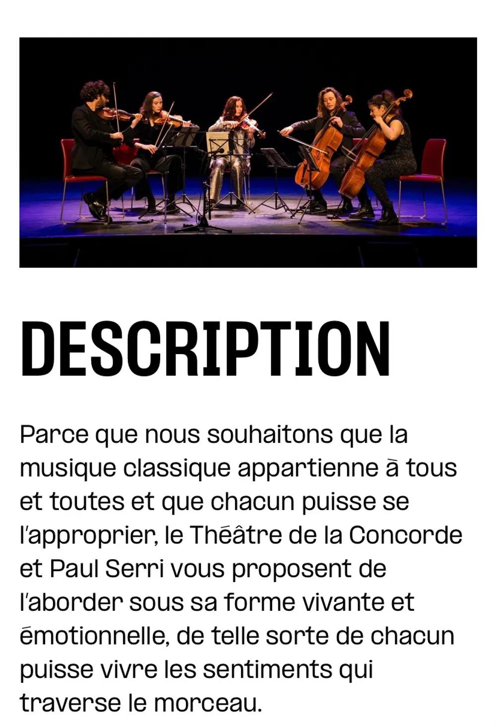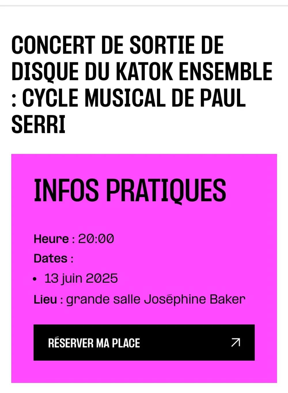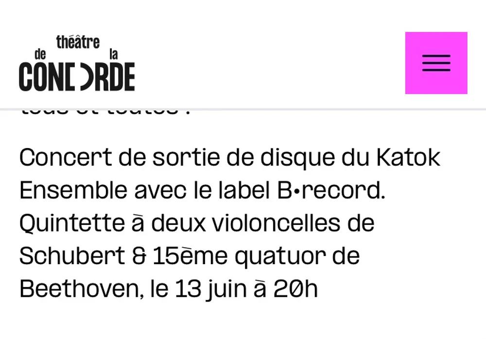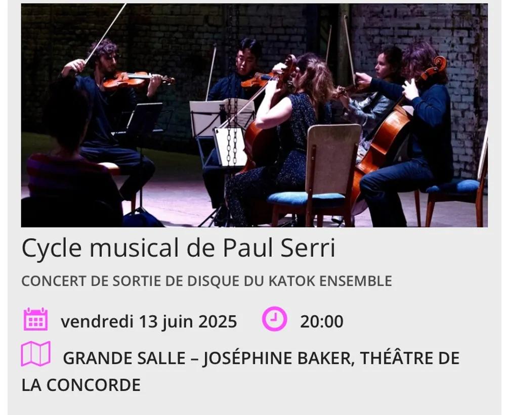 Concert de violon et violoncelle par l ensemble : Katok Ensemble. Il vous interpréterons Schumann et Beethoven, dans un quintette à deux violoncelles. Dans le cadre du cycle musical Paul Serri Ce concert est gratuit mais il faut réserver très vite son billet . Et arriver un peu avant le concert qui débute à 20hoo . ❌ Accessible uniquement aux personnes inscrites sur l’ activité et inscrite à Weezem 📛 si l’activité est complète, il n’y aura pas de possibilité de rajouter des personnes supplémentaires. Merci