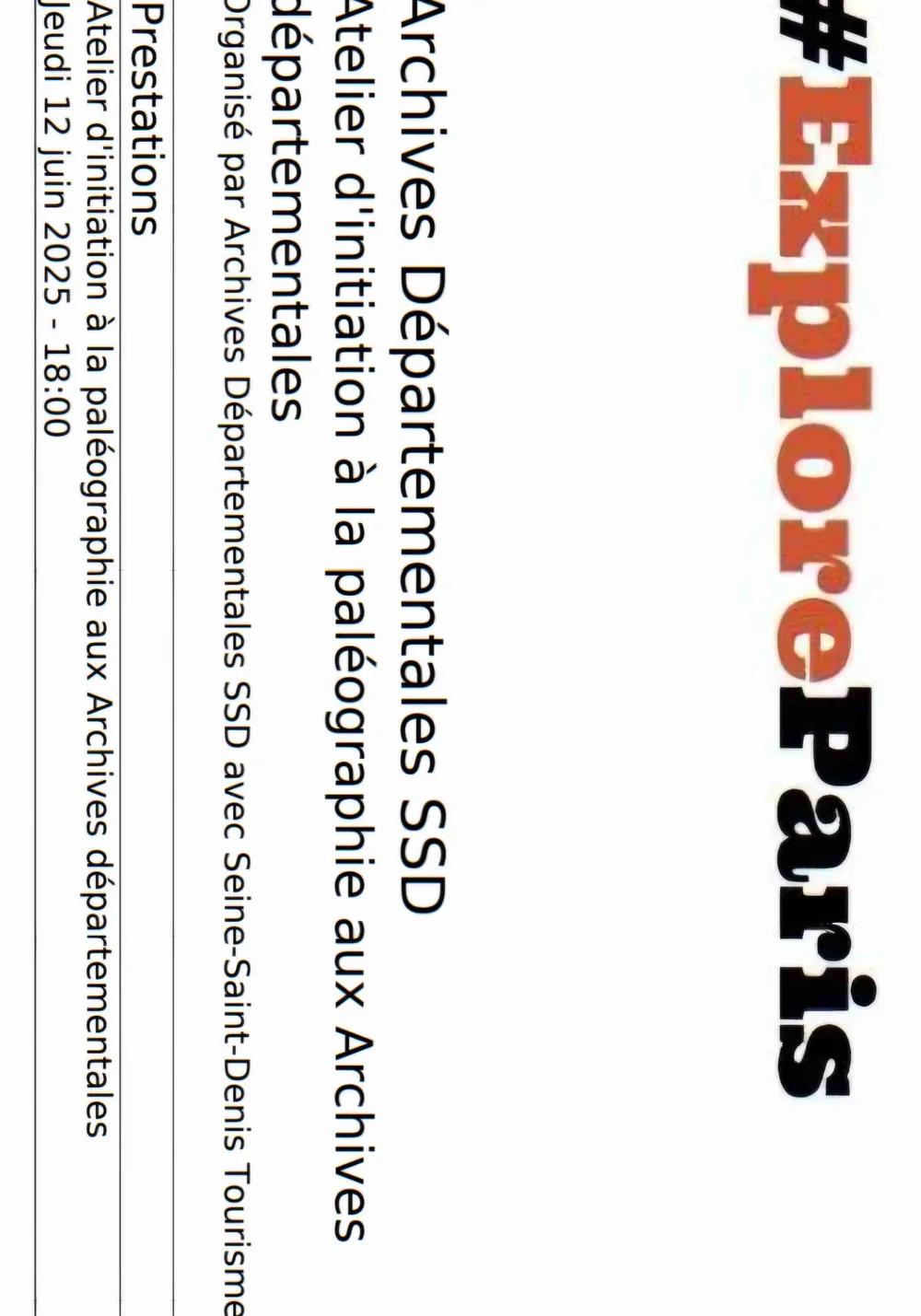 Atelier gratuit Initiation à la paléographie Archives départementales 93 Vous souhaitez vous initier au déchiffrement des écritures anciennes ? Christine Langé, directrice des Archives départementales de la Seine-Saint-Denis, archiviste-paléographe, dispense une fois par mois un cours de paléographie. Les participants déchiffrent des textes choisis parmi les fonds conservés aux Archives départementales. Réservation obligatoire : https://exploreparis.com/fr/2743-atelier-d-initiation-a-la-paleographie-aux-archives-departementales.html ⛔️ Profil sans photo 🚨 Sortie réservée aux inscrits sur Weezem