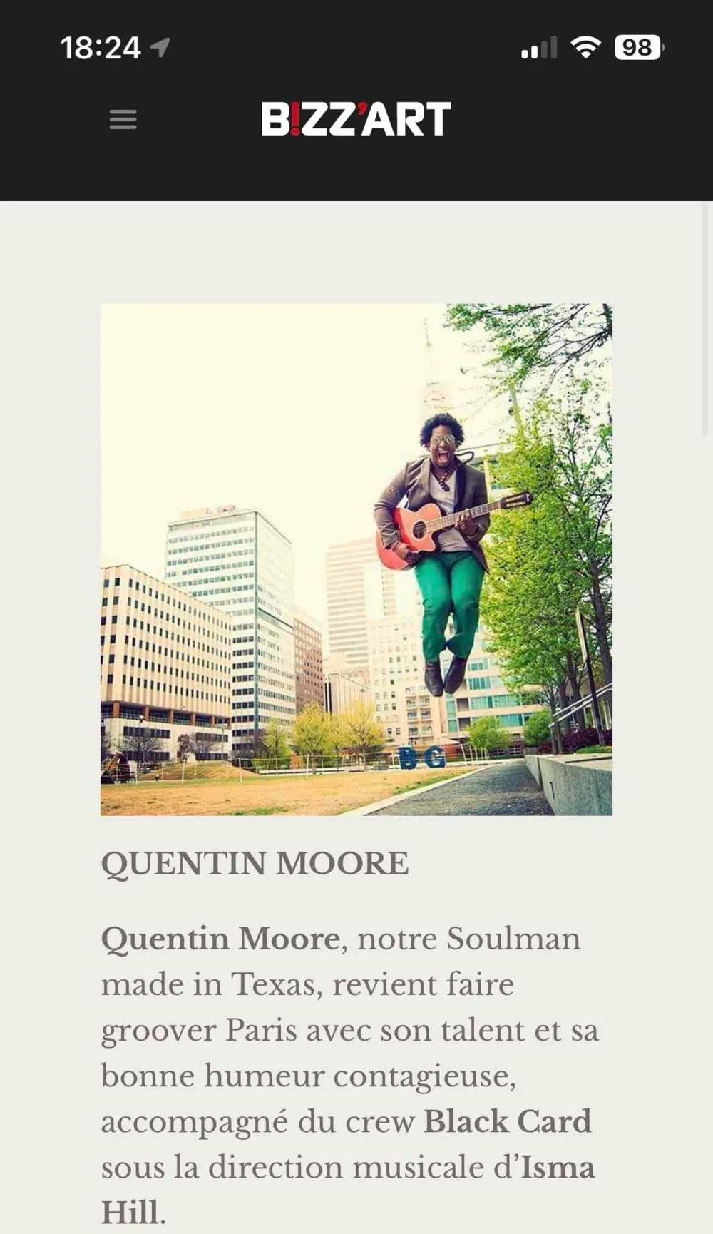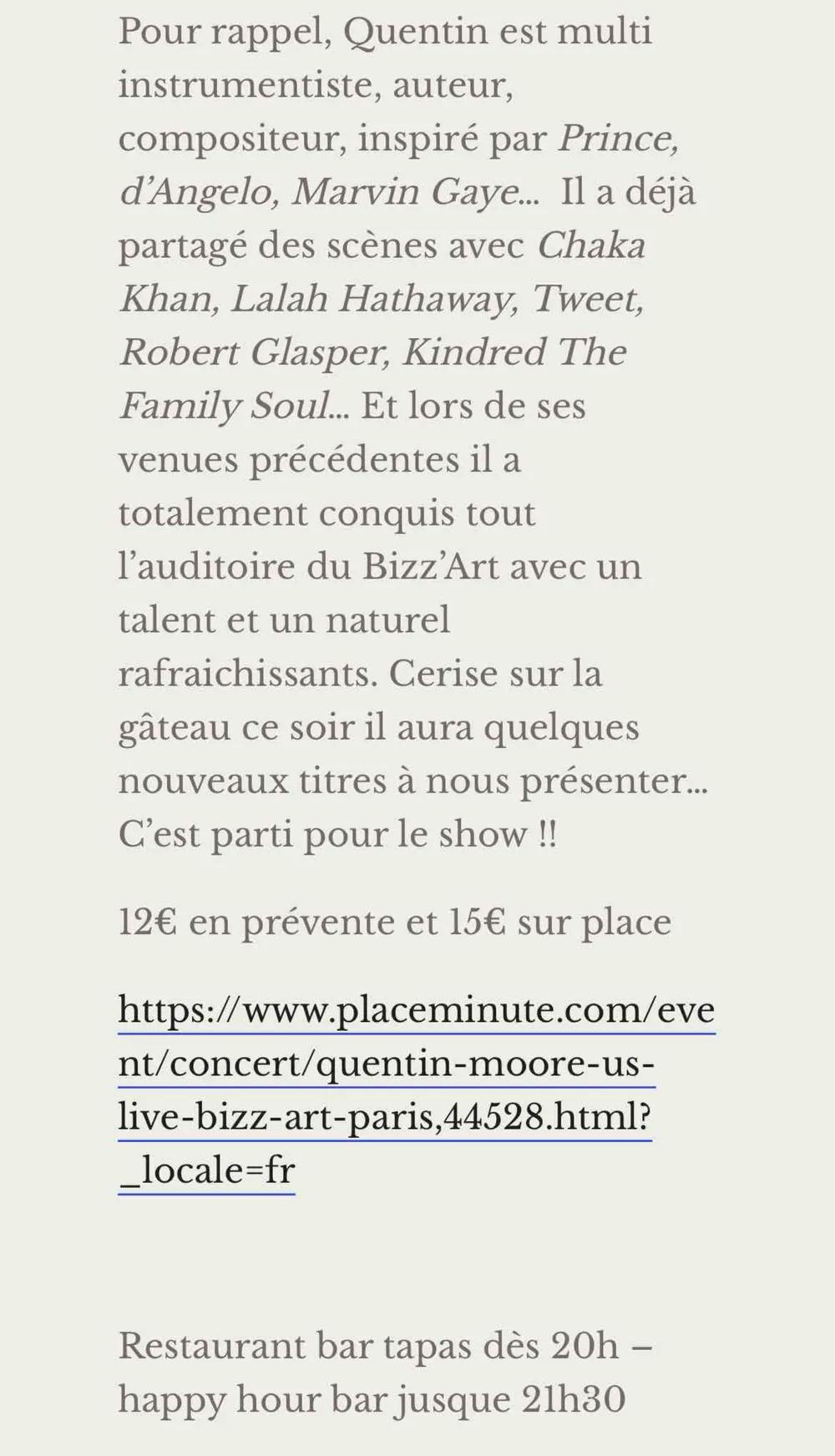 Hello 👋, J’ai 2 super nouvelles à vous annoncer : 1) l’artiste international Quentin Moore est de retour au Bizz’art ! 2) l’établissement nous fait un joli cadeau et offre l’entrée pour tous les Weezemeurs et Weezemeuses (les places sont en vente actuellement à 15€ ou 12€ en prévente) C’est gratuit pour nous sur présentation du QR code de la sortie. Plus d’infos sur cet événement : https://bizzartclub.com/event/quentin-moore-live-bizzart-paris-2/