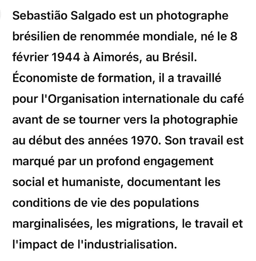 GENESIS – SEBASTIÃO SALGADO 📍 Galerie Polka J ai ouvert des places pour que d autres puissent venir . Pas de photos pas d inscrit Je vous demande de vous inscrire seulement si vous êtes certain de venir.. – Avec Genesis, Sebastião Salgado nous rappelle que la Terre a existé avant nous, dans toute sa splendeur sauvage, et qu’elle pourrait encore être préservée. Pendant huit ans, il a parcouru les derniers territoires vierges, capturant la beauté brute des glaciers, des déserts, des forêts profondes et des peuples vivant en harmonie avec leur environnement. Plus qu’une exposition, Genesis est un engagement. À travers ces images puissantes, Salgado nous invite à repenser notre lien avec la nature et à prendre conscience de sa fragilité. Chaque photographie témoigne d’un monde qu’il nous appartient de protéger. Un regard à la fois grandiose et urgent. Ne manquez pas cette immersion dans la beauté essentielle du monde.. Entrée libre . Un café après ?