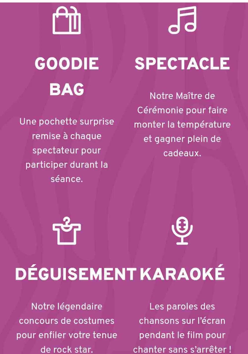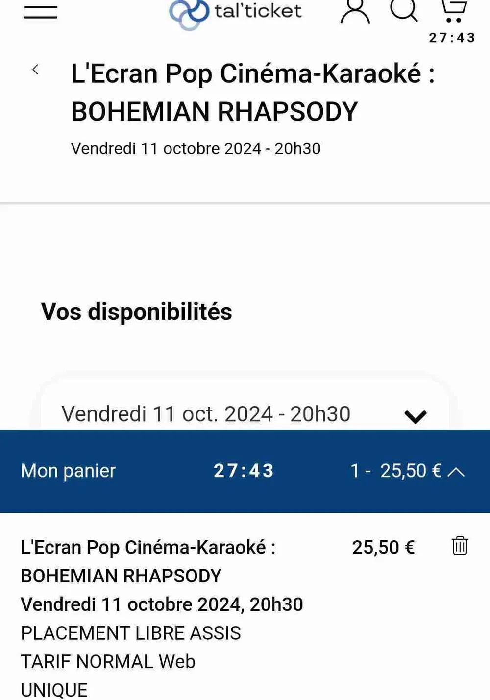 L'ECRAN POP CINEMA KARAOKE BOHEMIAN RHAPSODY Bienvenue dans l'univers de ce film culte ! (Re)découvrez BOHEMIAN RHAPSODY sur grand écran en version karaoké, dans une ambiance survoltée ! Spectacle, goodies bags & paroles sur l'écran : une expérience inédite vous attend ! Pendant la séance, lâcher prise, chantez, dansez et si le coeur vous en dit, venez déguisé dans la peau de vos personnages préférés. C'est libérateur, joyeux et follement drôle : vous êtes à l'écran pop, le premier cinéma karaoké en France ! J'ai pris mon billet chez Tal'Ticket, mais vous pourrez aussi trouver des billets sur d'autres sites tels que Fever, L'écran pop, BilletRéduc,... Séance en placement libre. Ouverture des portes à 20h00. Tarif : 25,50€ Réservation Tal'Ticket : https://www.talticket.com/reserver/lecran-pop-cinema-karaoke-bohemian-rhapsody-1/87395