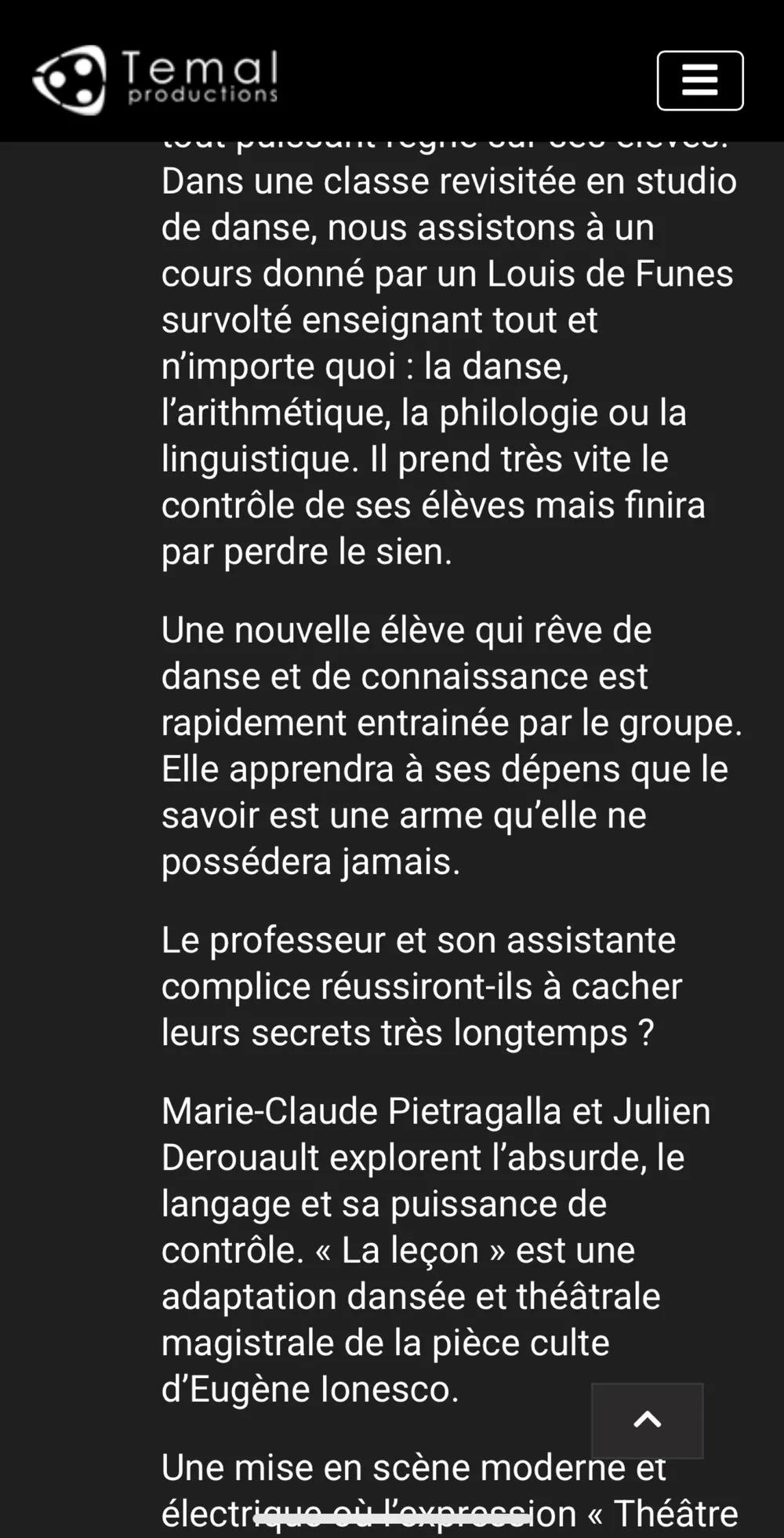 Vous connaissez La Leçon d’Ionesco ? C’est l’histoire complètement déjantée d’un professeur qui donne un cours de “mathématiques” à une élève ultra polie… Au début tout va bien. Puis, plus il parle, moins elle comprend… et plus lui devient follement cinglé. Résultat ? Une montée d’absurde irrésistible, entre éclats de rire et malaise délicieux… jusqu’à un final totalement inattendu. Maintenant imaginez cette folie, non pas racontée, mais dansée ! C’est le pari incroyable de Pietragalla : remplacer les mots par des gestes, la confusion par des corps qui se cherchent, et rendre l’absurde magnifiquement vivant. Danse par Julien Derouault Il il est magnifique !!! . Je l ai déjà vu et j y retourne . A ne pas manquer!!! Places à partir de 19 euros Verre après notre bar caché préféré histoire de continuer la danse https://youtu.be/Ae1oycZGLUk?si=IuXZ24ta4Qklvpd9