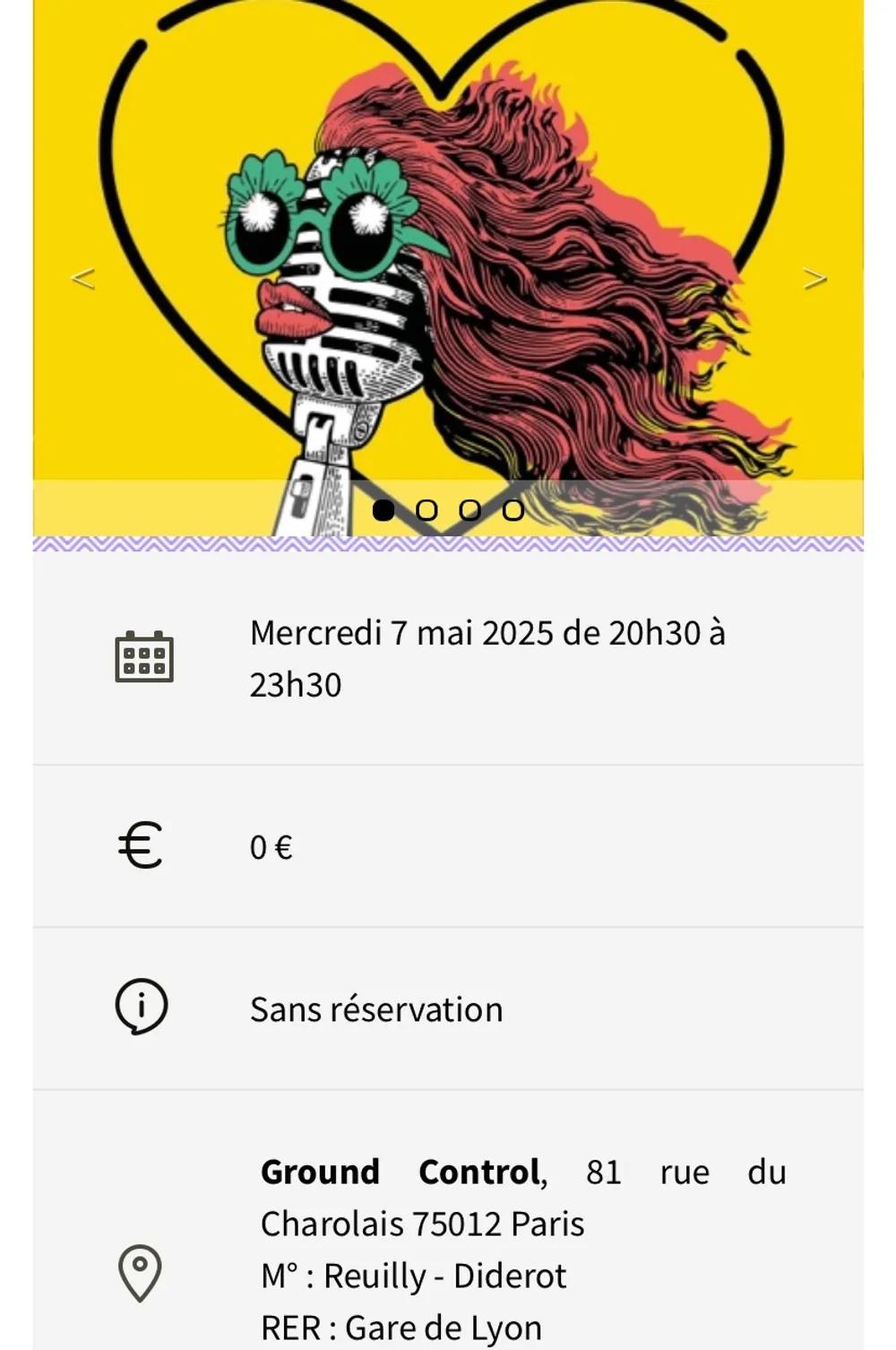 Je vous propose de venir chanter tous ensemble avec un super chef d’orchestre déguisée et tellement drôle, 😅😂🥳 Le lendemain c est le 8 mai et c est férié 🥳😃 ça se passe au ground contrôle. On chante ce qu’on veut , ce qu’on peut comme on veut Comme on peut et avec qui on veut, ou alors on chante pas du tout et c’est bien aussi. On peut aussi danser après. On peut boire et manger sur place. Pas besoin de réserver l’entrée gratuite