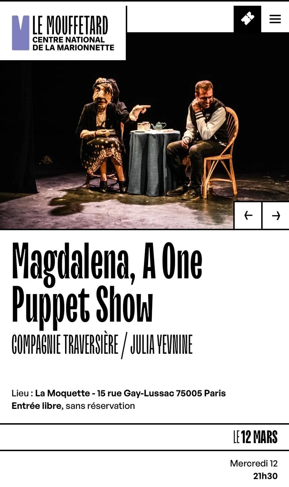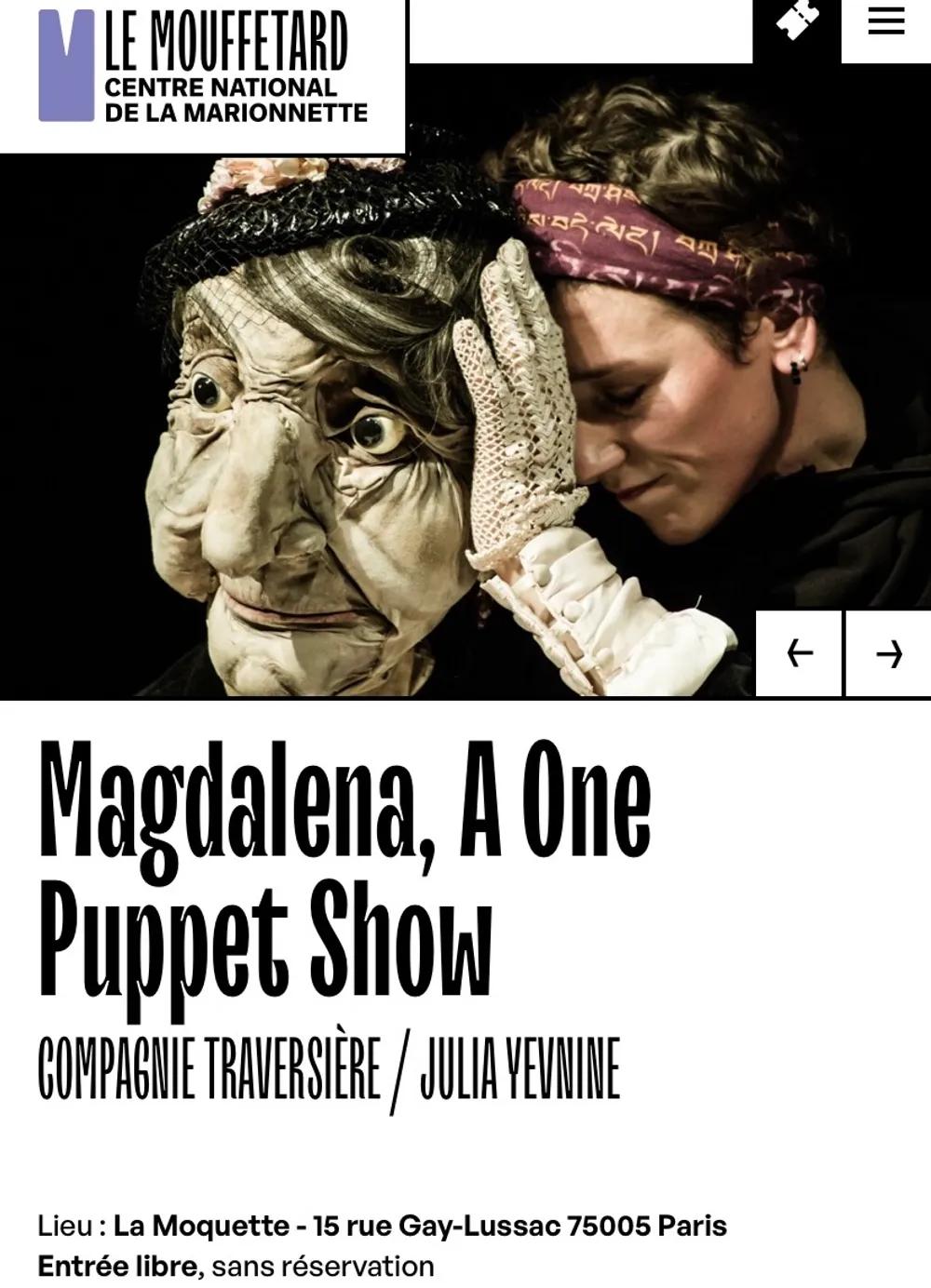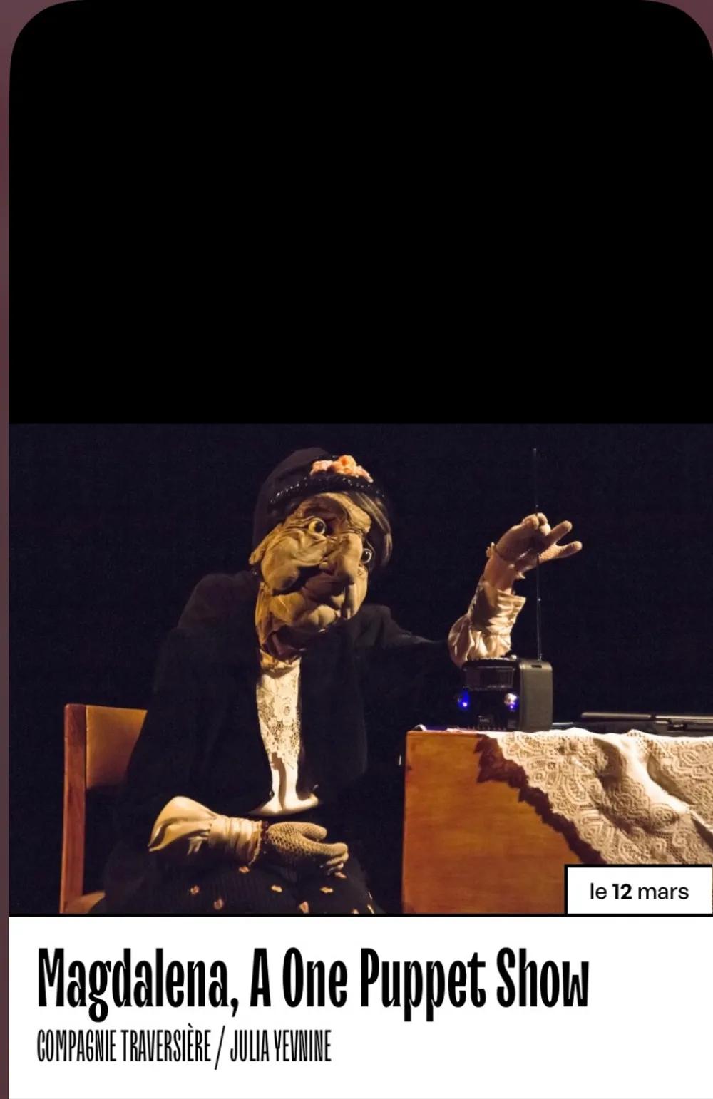 Spectacle de marionnettes par la compagnie : Traversière Formation le Moufttard Centre national de la Marionnette. Gratuit comme d hab 😉😁 sans réservation Spectacle pour adulte : MAGDALENA A ONE PUPPET SHOW C est l l’histoire de Magdalena. Une vieille femme pimpante, drôle et décalée. C’est aussi histoire, de réfléchir sur la vieillesse, et le passage à la retraite en France . En espagnol, on dit plutôt qu’on part en »jubilacion « 😂🍾😀🥳 ❌ accessible uniquement aux personnes inscrites à l’activité et inscrite sur Weezem . 📛 pas d’inscription supplémentaire si l’activité est complète. Merci