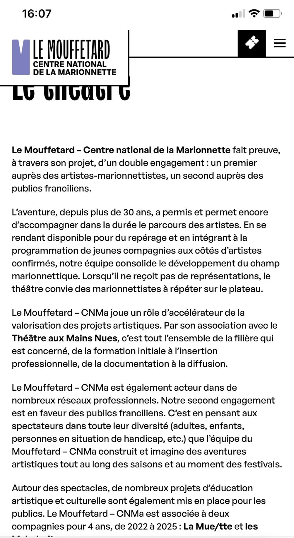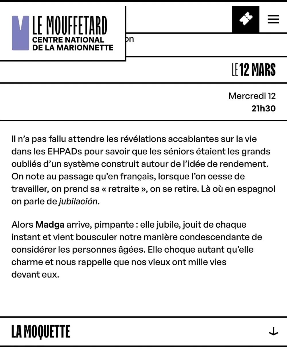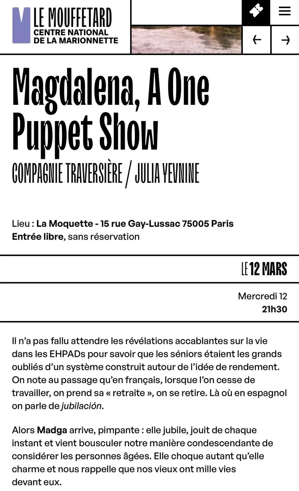 Spectacle de marionnettes par la compagnie : Traversière Formation le Moufttard Centre national de la Marionnette. Gratuit comme d hab 😉😁 sans réservation Spectacle pour adulte : MAGDALENA A ONE PUPPET SHOW C est l l’histoire de Magdalena. Une vieille femme pimpante, drôle et décalée. C’est aussi histoire, de réfléchir sur la vieillesse, et le passage à la retraite en France . En espagnol, on dit plutôt qu’on part en »jubilacion « 😂🍾😀🥳 ❌ accessible uniquement aux personnes inscrites à l’activité et inscrite sur Weezem . 📛 pas d’inscription supplémentaire si l’activité est complète. Merci