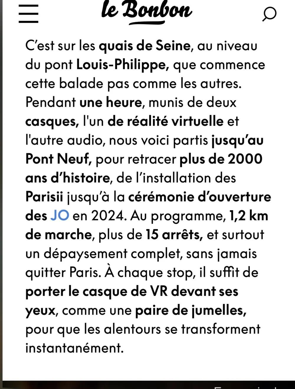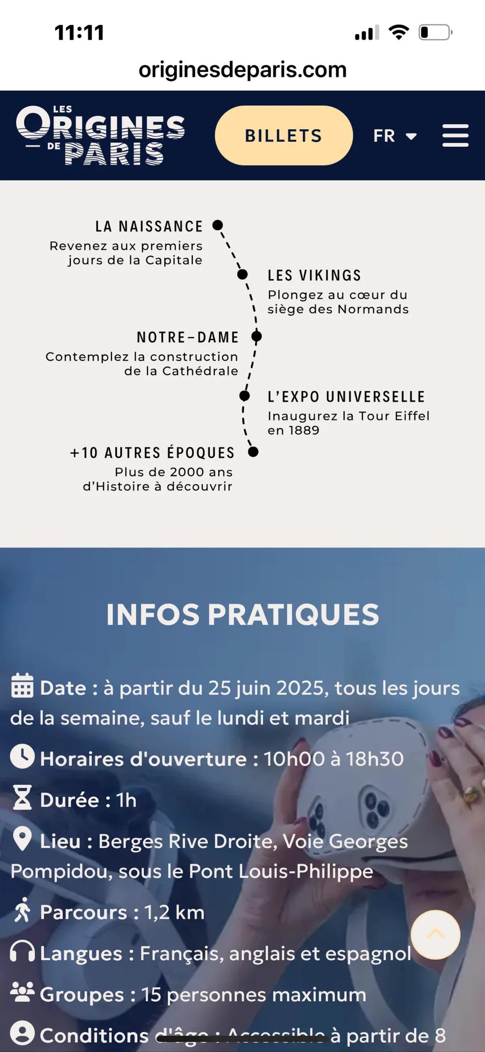 ÉPOUSTOUFLANT !! Une balade collective.. Et si en une heure, tu pouvais retracer 2000 ans d’histoire, casque sur les oreilles et réalité virtuelle devant les yeux — sans quitter les quais de Seine La presse écrit« on doit avouer que l’on est parfois restés sans voix face à certaines scènes assez spectaculaires, comme l’incendie du Pont-au-Change en 1621, l’érection accélérée de Notre-Dame, ou bien les vues aériennes de la capitale qui ponctuent la visite (attention, petit risque de vertige en perspective). Casque vissé sur les oreilles pour une immersion totale « 🔥 Tu assistes à l’incendie du Pont-au-Change en 1621, ⛪ tu vois Notre-Dame se construire sous tes yeux, 🦠 tu traverses la Peste noire, 🌊 tu revis la crue de 1910, 🏛️ tu marches dans la Lutèce gallo-romaine, 🎧 et tout ça avec précision historique, archives d’époque, costumes reconstitués et un vertige d’émotion. Balade 1, 2 km . inc👉 Réservez vos billets ici : https://feverup.com/m/359204/en?srsltid=… 28 eur va